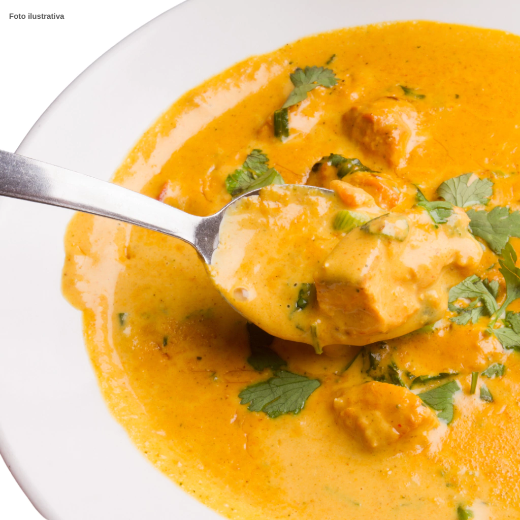 Caldo proteico de abóbora japonesa, caldo de legumes natural, frango desfiado e coentro. Sem glúten e lactose.