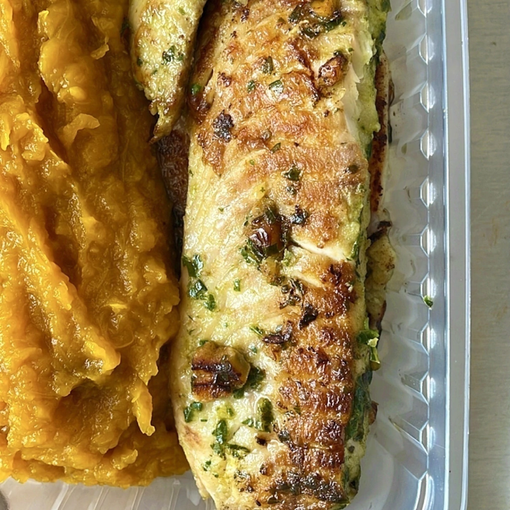 Tilápia grelhada finalizada com pesto de ervas frescas. Acompanha um purê de abóbora comm manteiga ghee.